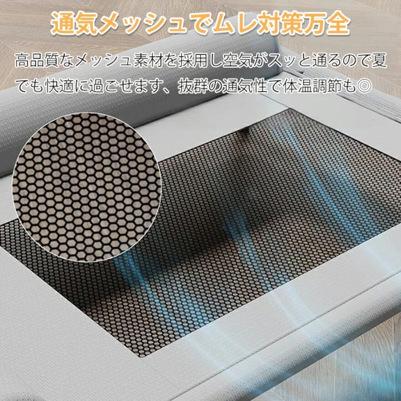 床から17cm高く、通気性のあるメッシュ、夏は涼しく、快適です。 床で寝るのと比べて清潔で快適、ワンちゃんの湿気や健康の心配もありません。